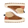 Ce modèle, plus citadin, se compose d’un mix de cuirs suédés, dans des tonalités de saison – camel, pêche – associés à des détails techniques qui rappellent les chaussures de marche, tels que les œillets métalliques, les lacets ou les sangles en nylon. Avec une semelle intérieure pensée pour amortir les chocs et maintenir un pied confortable, elle se porte aussi bien sur le bitume que sur les chemins rocailleux.