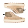 Ce modèle, plus citadin, se compose d’un mix de cuirs suédés, dans des tons doux et minimalistes – beiges, beiges rosés – associés à des détails techniques qui rappellent les chaussures de marche, tels que les œillets métalliques, les lacets ou les sangles en nylon. Avec une semelle intérieure pensée pour amortir les chocs et maintenir un pied confortable, elle se porte aussi bien sur le bitume que sur les chemins rocailleux.