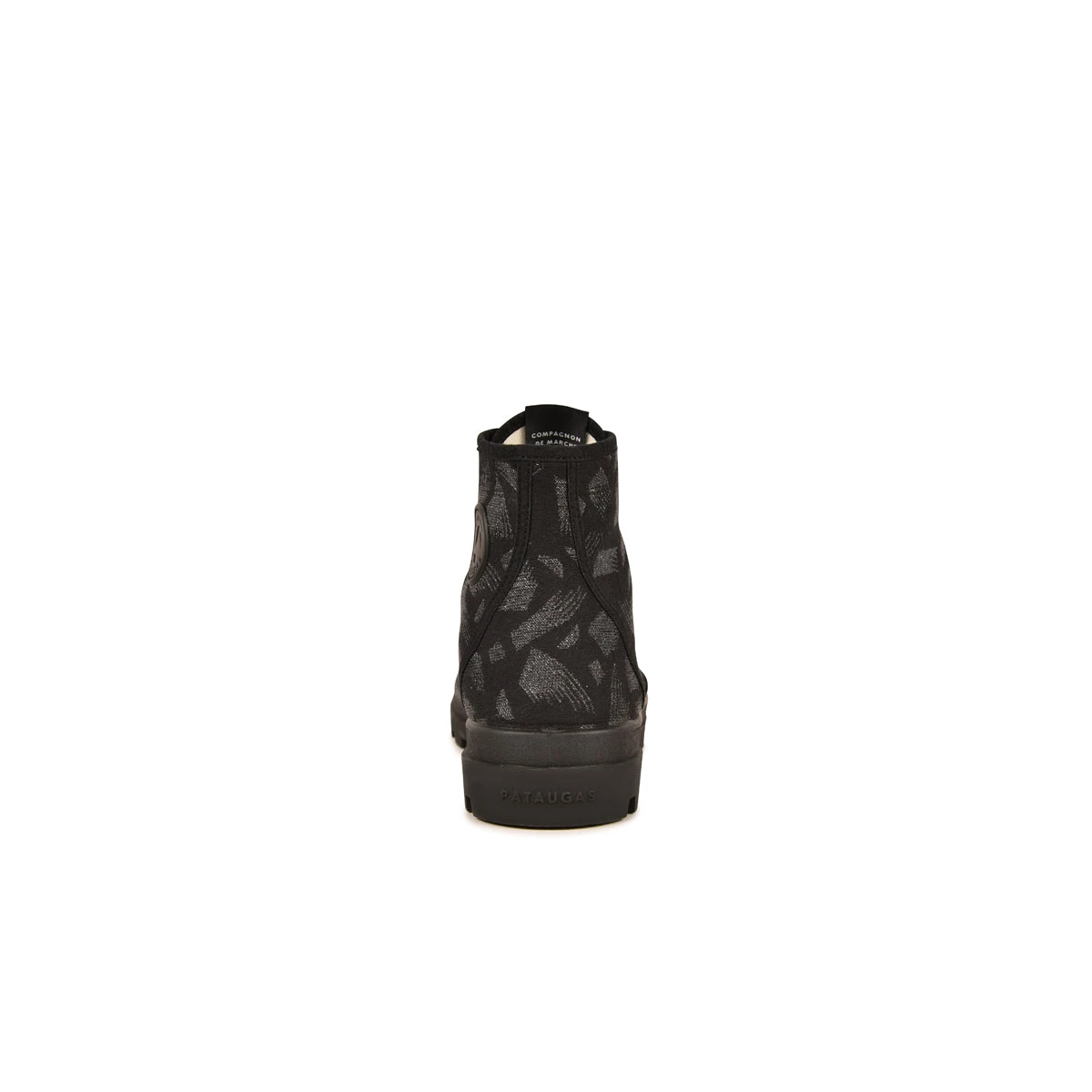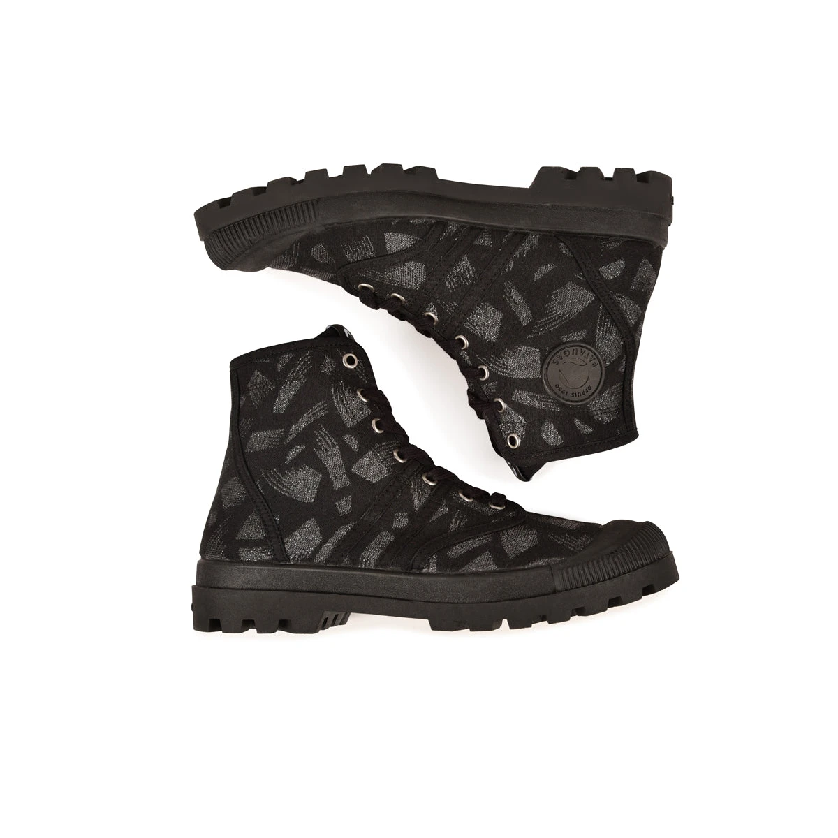 La boots en toile montante pour femme Authentique se pare d’une toile à motifs noirs modernes. Légèrement irisée, cette toile tissée en France est également robuste et légère. Cette chaussure a été assemblée par un processus de vulcanisation dans nos ateliers espagnoles.